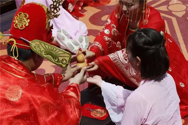 合巹即飲合巹酒,合巹酒以一切為二的葫蘆分作新婚二人酒杯,各飲一半再交換對(duì)飲后將葫蘆合二為一。因葫蘆的瓤是苦的代表夫妻二人今后要同甘共苦、相濡以沫。