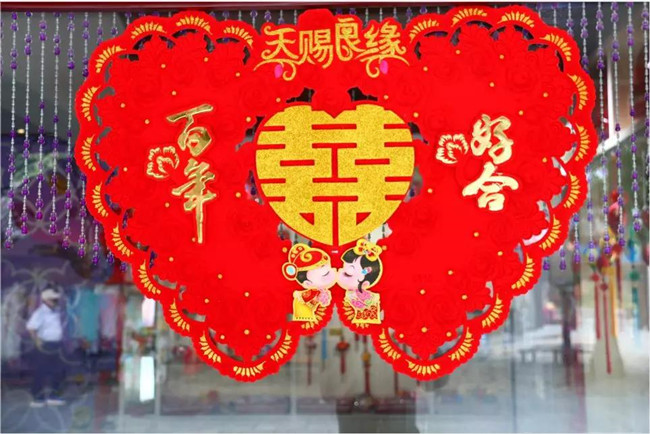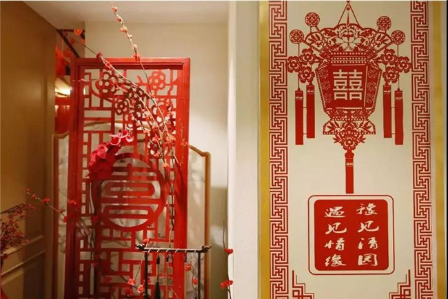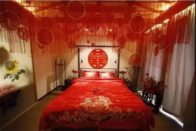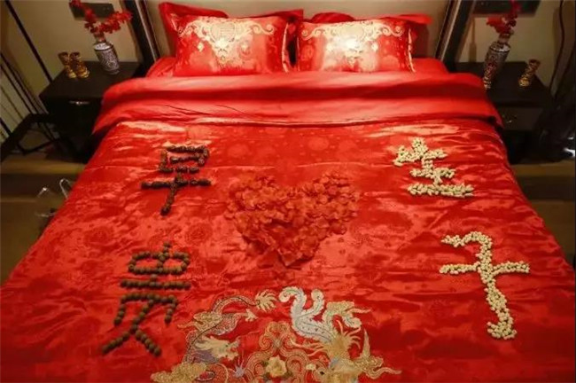 七夕婚房美起來(lái)浪漫的紅色:紅棗、花生,被擺成早生貴子的形狀;被子、枕頭,都是龍鳳呈祥的樣式。