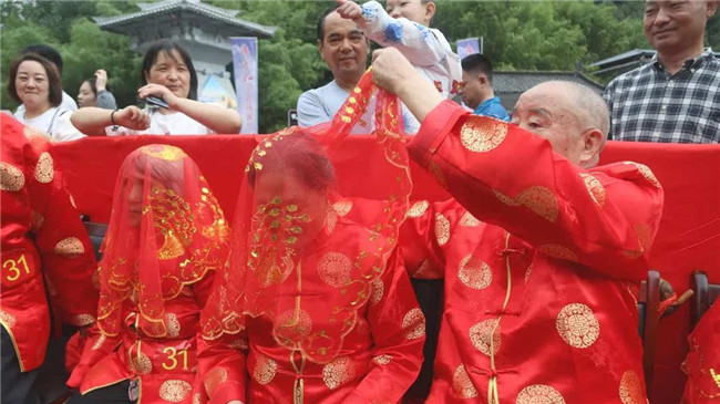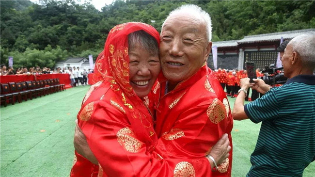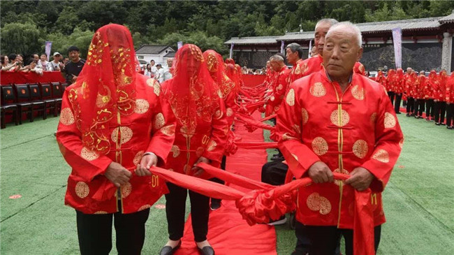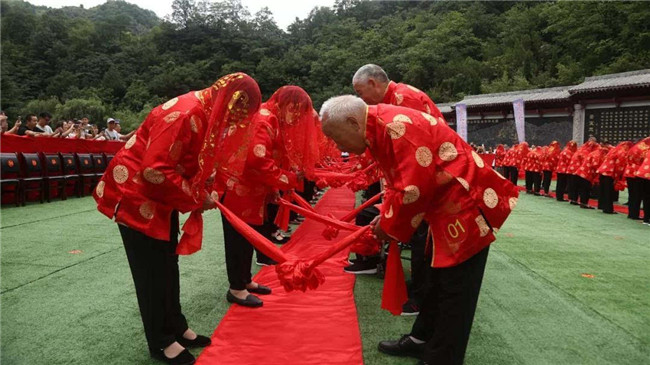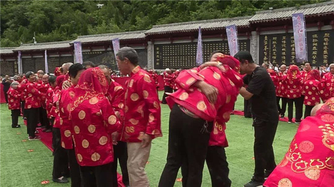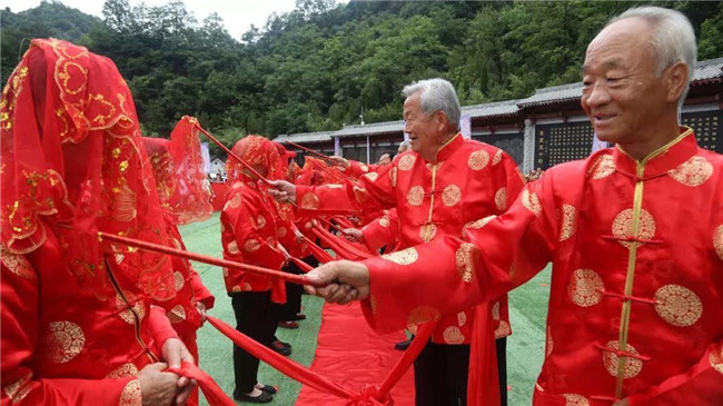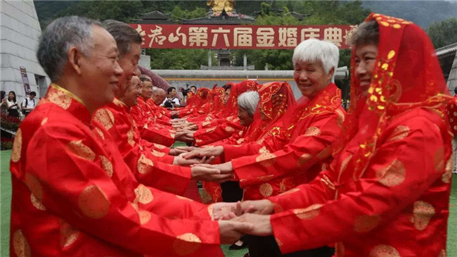 時(shí)光荏苒,歲月如梭。“金婚”這美麗的詞語,是對愛情最完美的詮釋。金婚慶典儀式通過執(zhí)繡球入場、夫妻對拜、挑蓋頭、執(zhí)手禮、后輩獻(xiàn)花等議程,在老君山下見證了這38對老人們半個(gè)世紀(jì)的愛情。