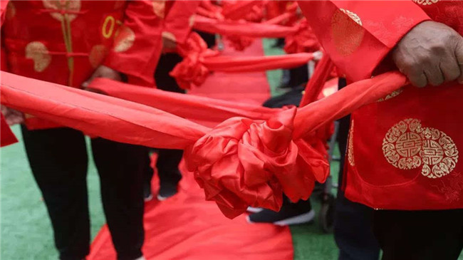 一條紅絲綢,兩人牽繡球,月老定三生!伴隨著鳴炮奏樂,老人為老伴蓋上紅紅的蓋頭,相伴入場。