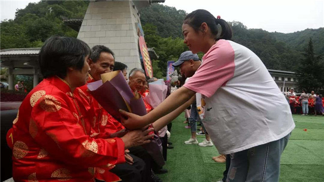 隨后,子女后輩向老人們敬獻(xiàn)花束,表達(dá)對長輩的敬愛之心。