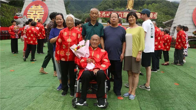 圖:8月7日,老君山第六屆金婚慶典活動現(xiàn)場,38對金婚老人擺出“囍”字。