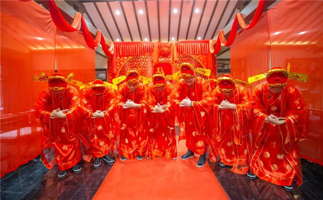 宴請婚禮儀式后,新人及親朋好友共赴清明上河園孫羊正店,高朋滿座,歡聚一堂,舉杯暢飲,共同祝福7對新人喜結(jié)連理,結(jié)永世姻緣。