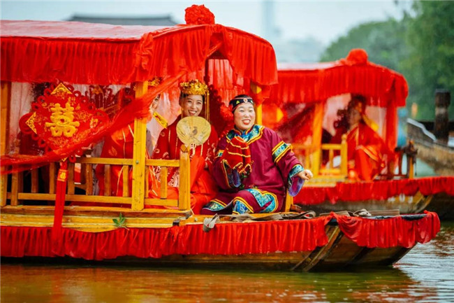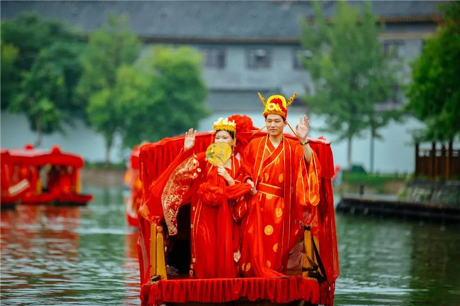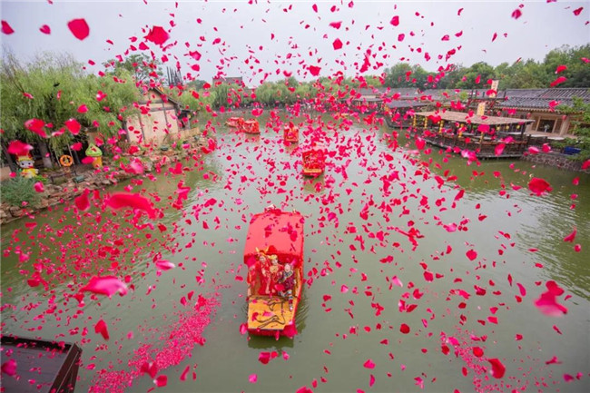 七對新人乘坐喜船行駛到虹橋和聽雨橋時,玫瑰花瓣從天而降,一簾幽夢,十里柔情……