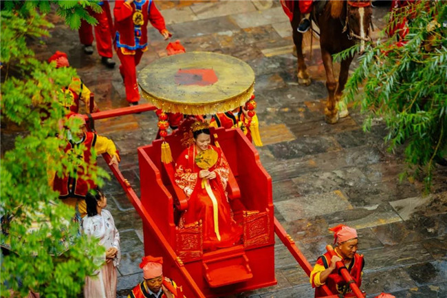 停船靠岸,喜轎早已在岸上等候。鑼鼓開道、嗩吶齊鳴、高頭大馬、八抬大轎、十里紅妝、浩浩蕩蕩。