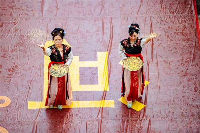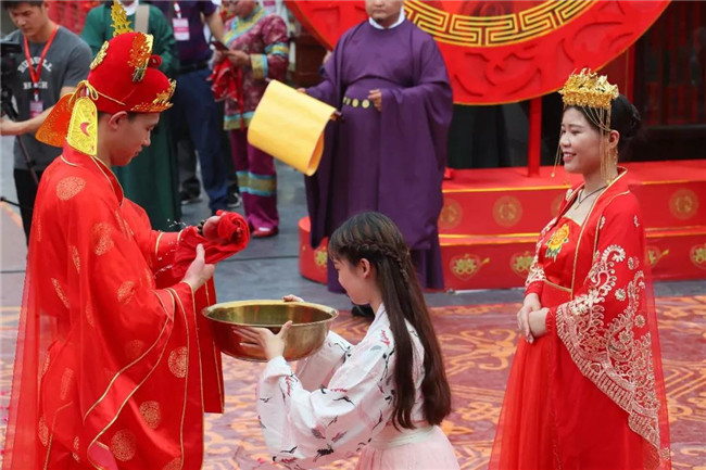 儀式己亥年七夕佳節(jié),七對新人進(jìn)入婚禮主儀式區(qū)——清明上河園上善門前,在贊禮官的引導(dǎo)下,鼓樂禮天、誥上禮天、新娘卻扇、新郎墊雁、五谷設(shè)道、牽巾入場、秤舉蒙首、新人沃盥、三拜九叩、同牢合巹、結(jié)發(fā)同心等環(huán)節(jié)一一呈現(xiàn)。