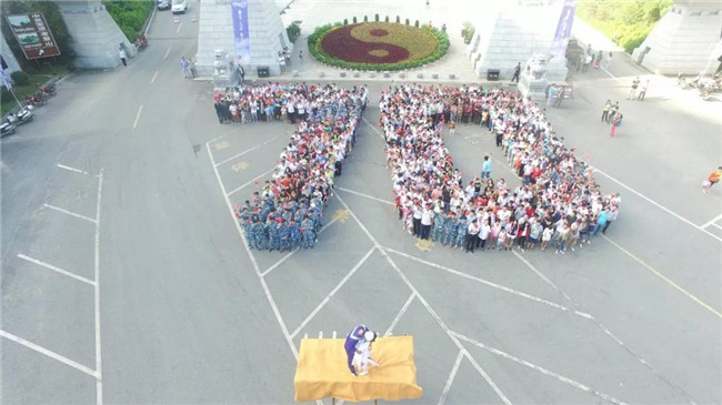 2018年8月16日, 百對(duì)金婚老人擺出“牽手50金婚”字樣。