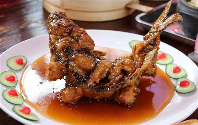02 王樓·鯉魚焙面 鮮活的黃河大鯉魚被師傅花樣改刀,前后翻滾入至油鍋,一瞬間就被炸至金黃,再在秘制好的醬汁里翻滾拌勻,最后蓋上面絲,魚肉中夾雜著醬汁的甜味和面食的淳樸,這道菜,真中!