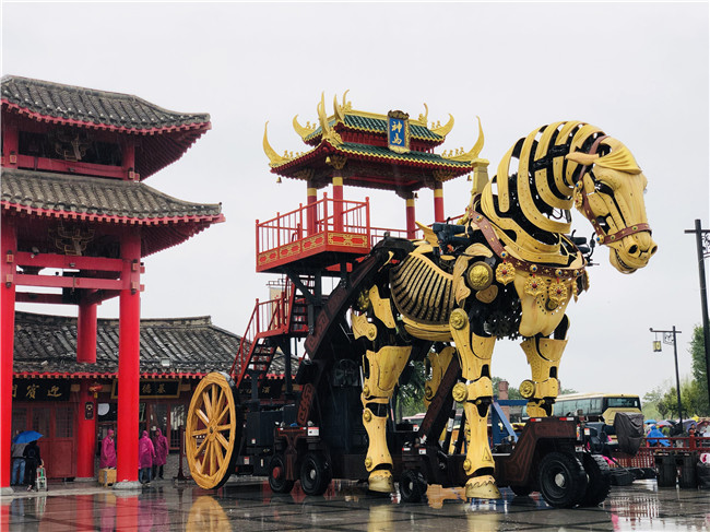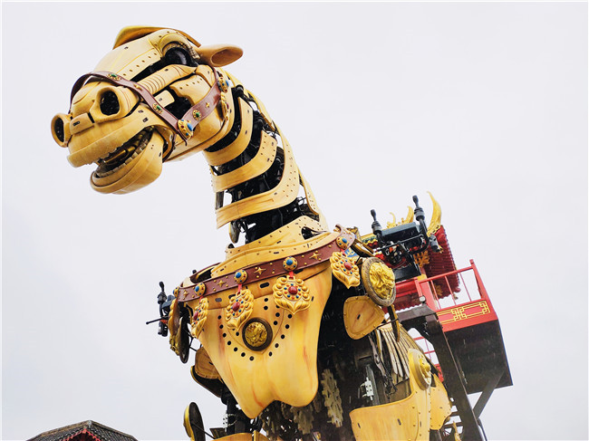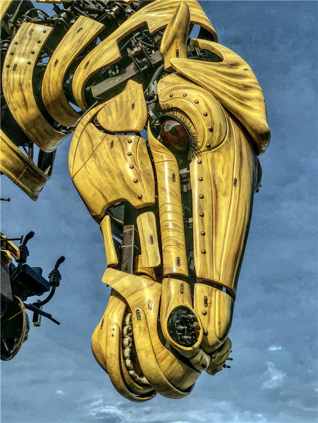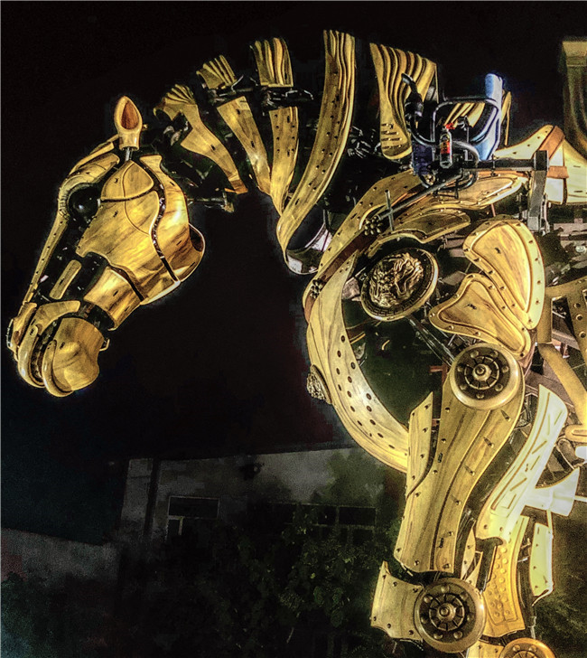 中華巨馬高8.4米,長9米,加上馬車長14.5米,自重47噸,最大的亮點(diǎn)是它以機(jī)械結(jié)構(gòu)為核心,98余個(gè)運(yùn)動(dòng)關(guān)節(jié)活靈活現(xiàn)地還原了馬的體態(tài)健碩、神采奕奕。