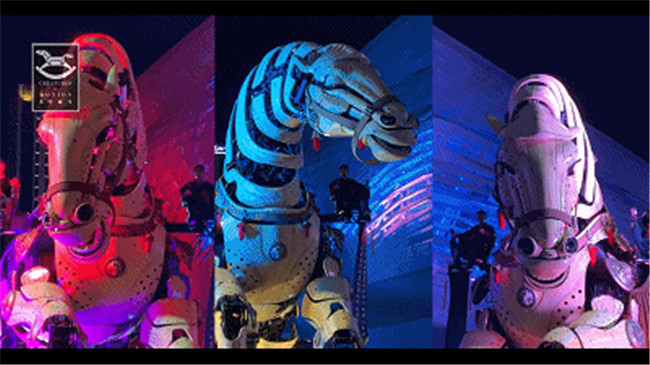 可實(shí)現(xiàn)連貫的行走、躍起、昂首、尾巴擺動(dòng)、腹腔及五官運(yùn)動(dòng)等仿生的姿態(tài),巨馬站立時(shí)8.4米,躍起時(shí)12米,造型偉岸,如同天馬下凡。