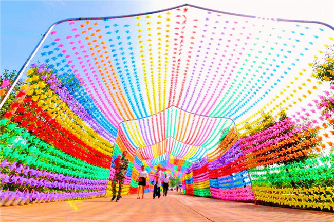 七彩風(fēng)車長廊,在風(fēng)的驅(qū)動(dòng)下一起旋轉(zhuǎn),悅耳的聲音緩緩的從耳邊吹過,讓人仿佛置身在一個(gè)浪漫多彩的童話世界,只想靜靜享受這一刻的美好時(shí)光。
