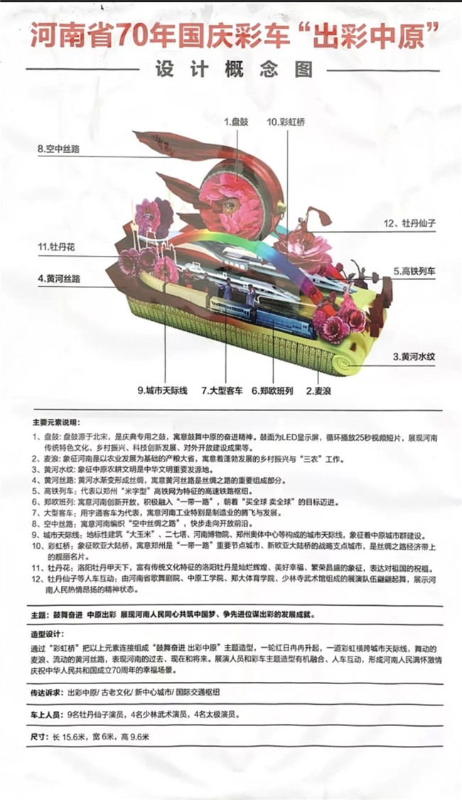 河南彩車“出彩中原”車身由盤鼓、麥浪、黃河水紋、黃河絲路、高鐵列車、鄭歐班列、大型客車、空中絲路、城市天際線、彩虹橋等多種河南元素組成。綜合展現(xiàn)了我省在文化、科技、對(duì)外開放等領(lǐng)域的成就。