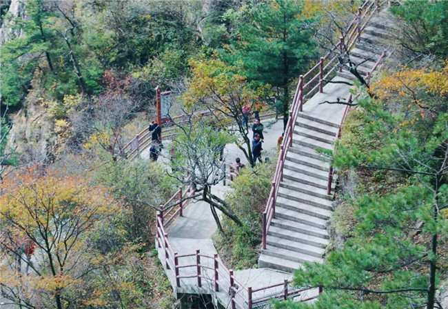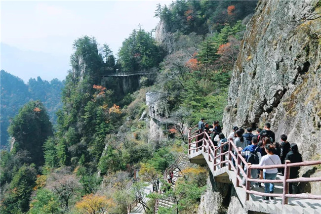 漫步于懸空棧道,眼觀路旁簇簇紅葉暢行其中,讓人賞心悅目。