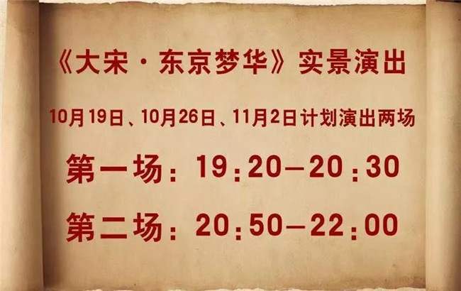 為滿足游客需要,《大宋·東京夢華》將在10月19日、10月26日、11月2日演出加場。