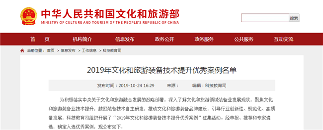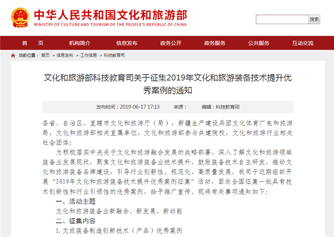 為積極落實(shí)中央關(guān)于文化和旅游融合發(fā)展的戰(zhàn)略部署,聚焦文化和旅游裝備技術(shù)提升,鼓勵(lì)裝備技術(shù)自主研發(fā),推動(dòng)文化和旅游裝備品牌建設(shè),引導(dǎo)行業(yè)創(chuàng)新性、規(guī)范化、高質(zhì)量發(fā)展,文化和旅游部科技教育司組織開(kāi)展了“2019年文化和旅游裝備技術(shù)提升優(yōu)秀案例”征集活動(dòng)。
