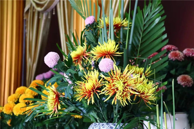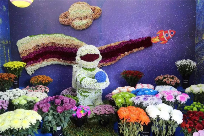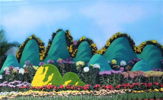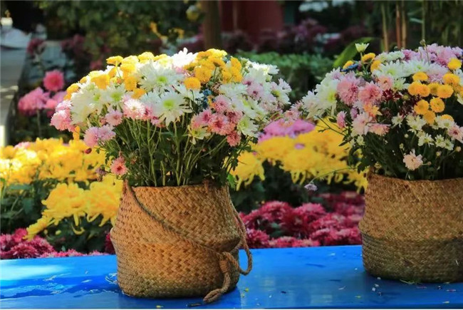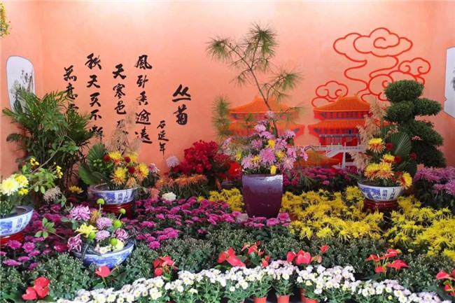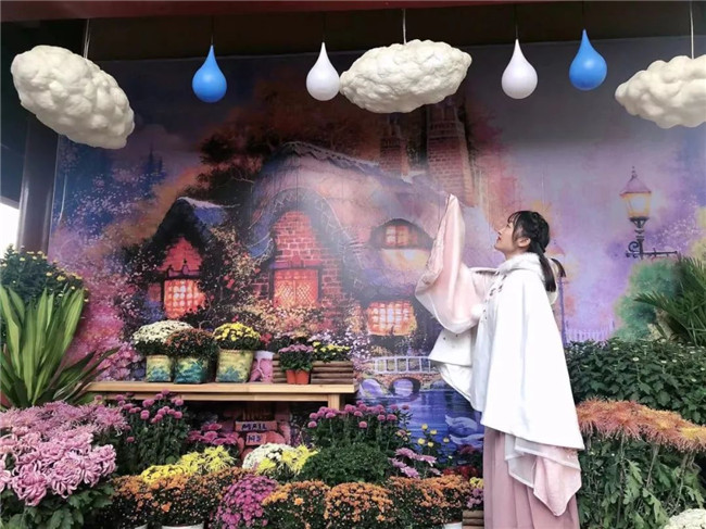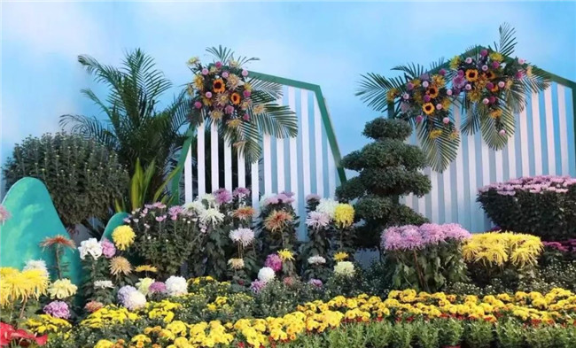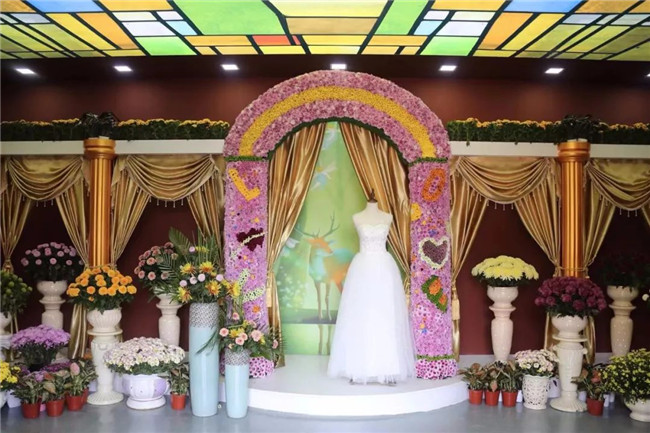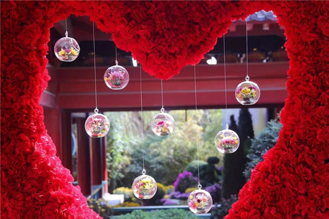 花藝編制的大愛心框景掩映在鮮花叢中,菊花仙子在朝你比心~