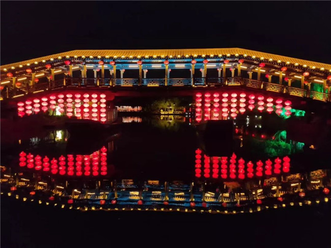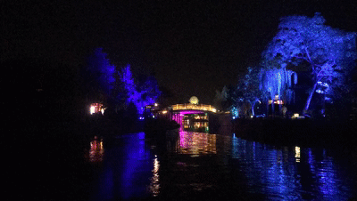 隨著船工的一聲:“點燈,開船咯!”聽雨橋上千百盞紅燈籠亮起來,隨著音樂閃動。游船駛出雙亭橋碼頭,穿過燈籠簾帳,在兩岸流漓燈影中,緩緩向前。