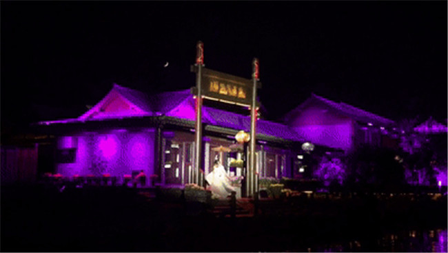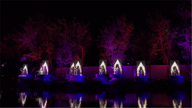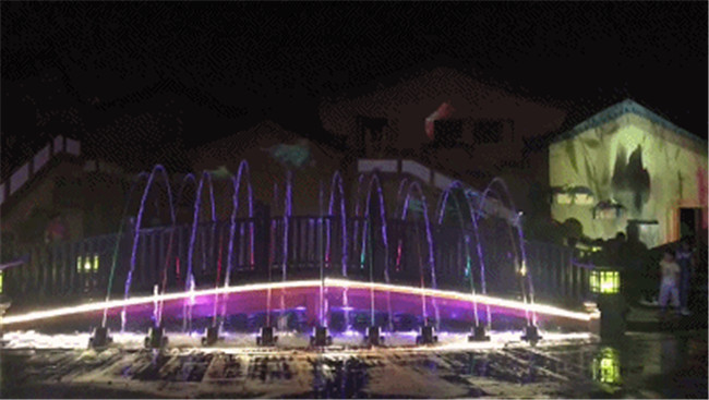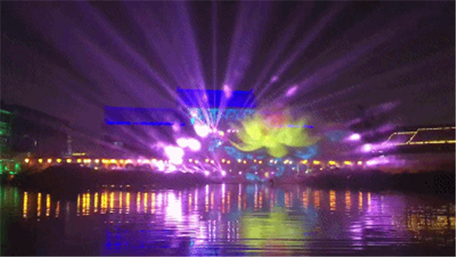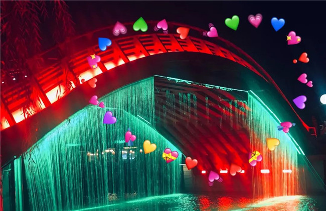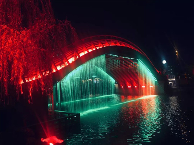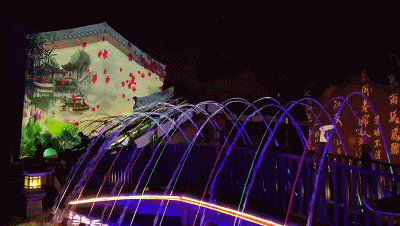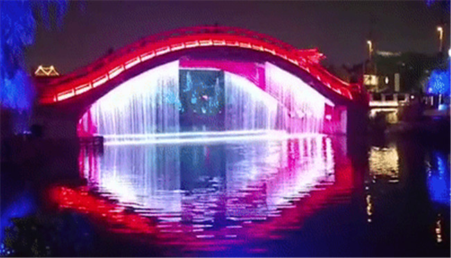 2、虹橋月色繼續(xù)前行,虹橋水幕飛瀉而下。水幕投影上開始出現(xiàn)各種祥云。明月的光輝逐漸灑滿整個水幕。在燈光的配合之下,整個虹橋區(qū)域一片絢麗夢幻的景象。