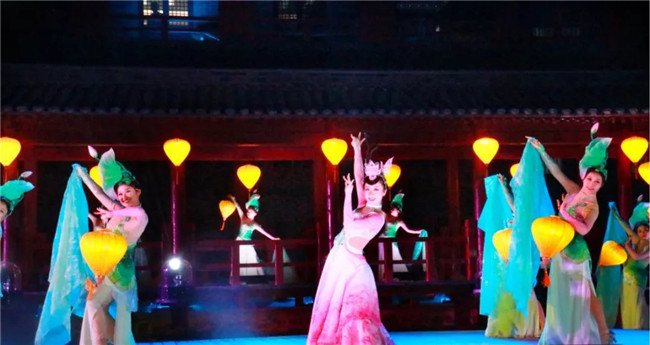 前方一片荷塘月色,一群美麗的女子魚貫而出,在柳蔭下、荷花邊,隨風(fēng)跳起輕柔的舞蹈,仙子們的舞蹈與花兒、柳枝仿佛在爭春爭俏一般。