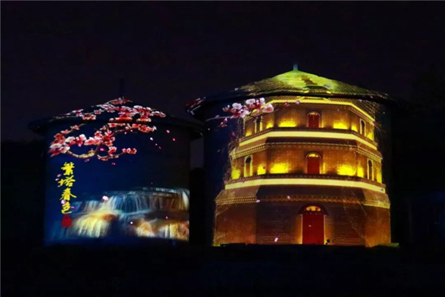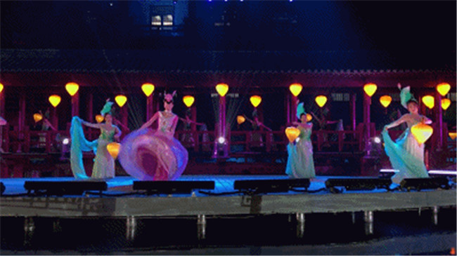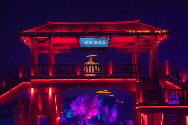 游船駛過吊索橋之后,岸邊的燈光亮起,樂聲陣陣,舞姿翩翩,古老的繁塔瞬間春意盎然。