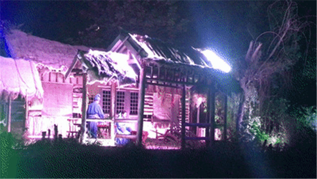 6、田園牧歌游船向前行駛,在岸邊茅草屋的小院里,一對夫婦正在納涼喝茶,男子看書,女子在給可愛的孩子哼唱小曲,可真是樸實恬靜的鄉(xiāng)間生活啊。