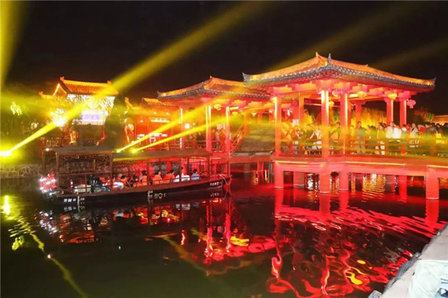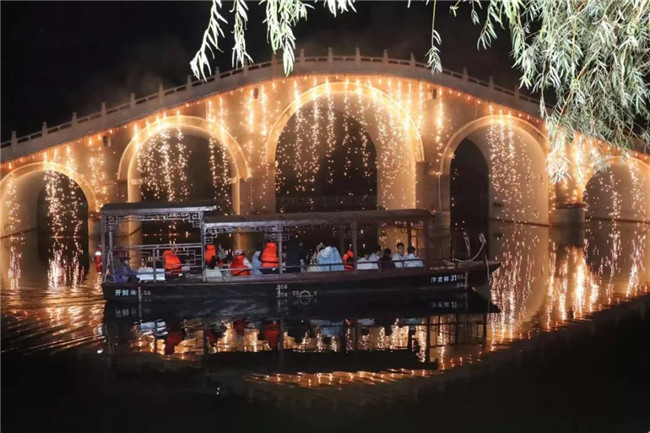 5、繁塔春色游船駛過吊索橋之后,岸邊的燈光亮起,樂聲陣陣,舞姿翩翩,古老的繁塔瞬間春意盎然。