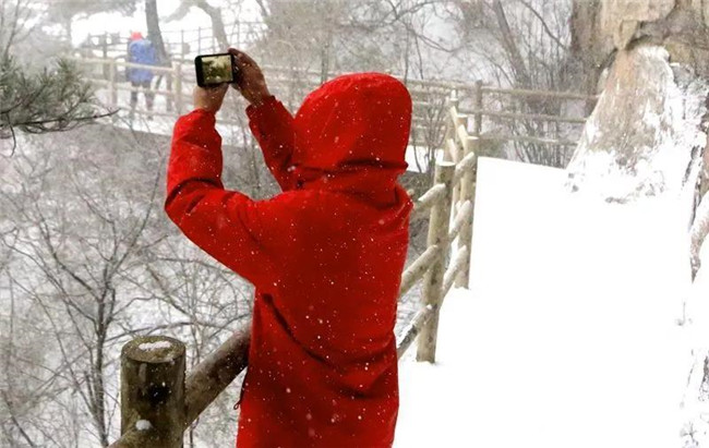 在雪中駐足拍照的游客