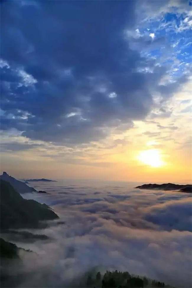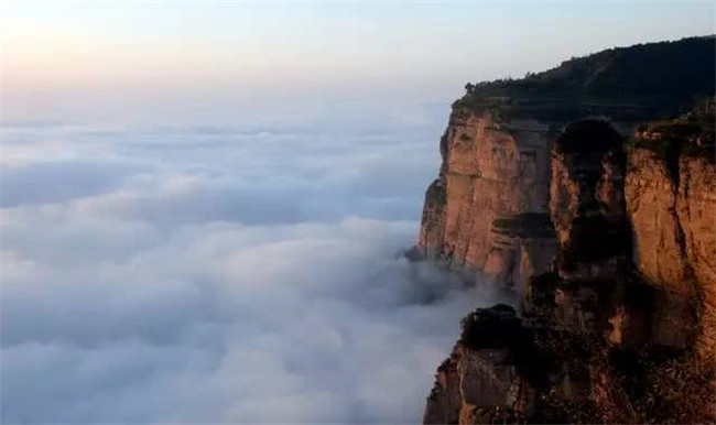 落日霞光給白云披上了裟,云海如奔騰的江水洶涌澎湃,蔓延吞噬著若隱若現(xiàn)的山峰。高聳的山峰迎著霞光,泛著金黃,夾雜著片片白霜,似“山含九朵白”。站在山之巔、云之角,俯瞰綿延不盡的新鄉(xiāng)南太行山脈,堪稱夢幻國度。