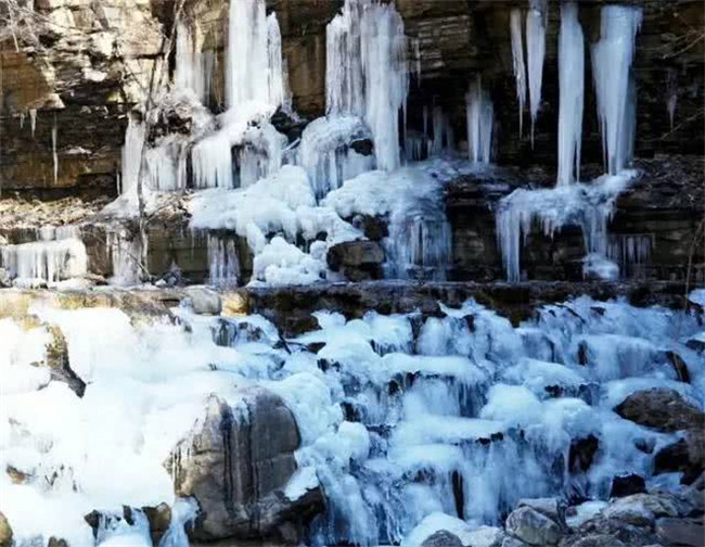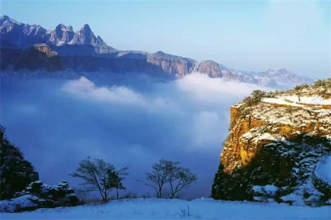 冬季冰掛晶瑩花冰凌 剔透樹冰掛,在金燦燦陽光的輝映下銀光閃閃,反射著水晶般的光輝,驚艷如花,仿佛是一座瑰麗的水晶宮。登山頂看去“云來山更佳,云去山如畫”,具有“白雪無古今,乾坤失曉昏”的光輝。多彩的霞光映染雪峰,新鄉(xiāng)南太行的唯美冬韻也盡收眼底。