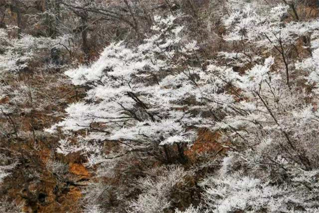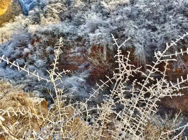 新鄉(xiāng)南太行的霧凇,猶如銀盔銀甲的衛(wèi)士,守護(hù)著太行山。放眼望去,一望無際千姿百態(tài)的雪樹銀花,使人心曠神怡。那一簇簇、一團(tuán)團(tuán)、一串串晶瑩剔透的銀色花朵,構(gòu)成了一個冰清玉潔,絢麗無比的世界。