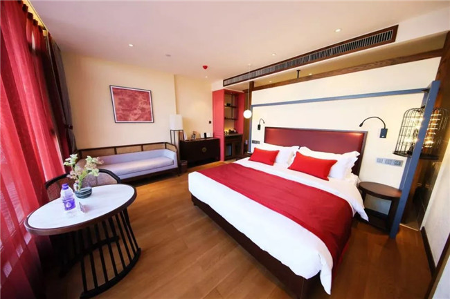 滿庭芳精品客棧房間內(nèi)設(shè)有落地大窗、智能化現(xiàn)代家具、手自一體播放機(jī)、智能TOTO馬桶……一系列現(xiàn)代化設(shè)施確保朋友們住得舒心。