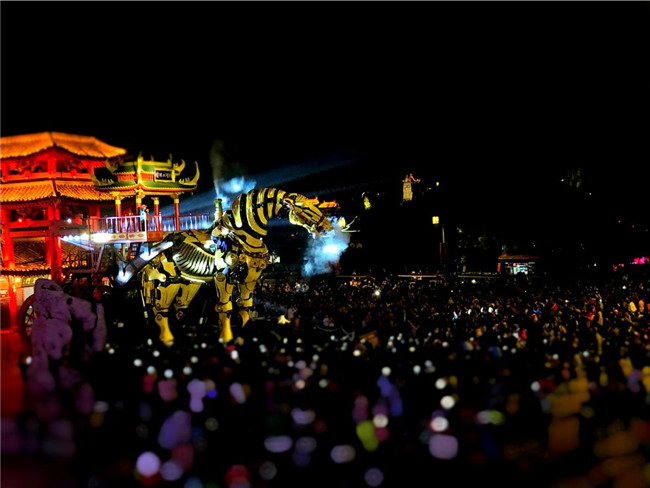 夜晚的第一個(gè)精彩,存在于中華巨馬的身上,矯健的身姿在閃光燈匯成的星星海里更顯神采奕奕。一聲精氣十足的嘶鳴聲,拉開(kāi)了清明上河園夜游的序幕。