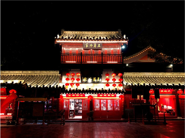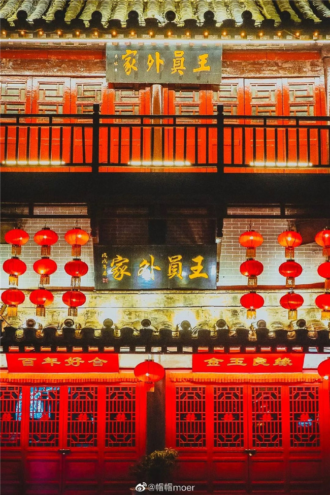 夜晚的第六個(gè)精彩,是王小姐的繡樓——王員外家,招親時(shí)間已經(jīng)過(guò)去,夜晚的繡樓像它的主人王小姐一樣動(dòng)人。門(mén)頭上的百年好合和金玉良緣,好似在祝福著全天下的有情人終成眷屬。