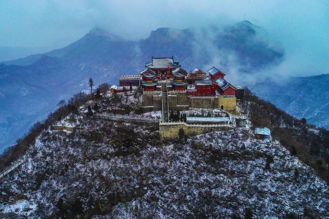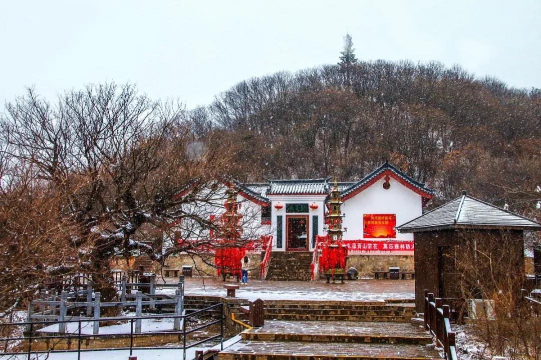 一場雪,云臺山變成銀色圣地,雪落枝頭,洗盡鉛華,在飄灑的白雪中,守護那一抹紅。寺廟的屋檐覆蓋著一層白色,像水墨畫又像老照片,禪意十足。