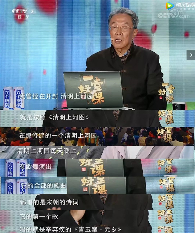 王蒙先生還說:“這辛棄疾是一個(gè)愛國的大詞人,但是他對(duì)開封的上元佳節(jié)居然有這樣的描寫,這樣的歌頌,太感動(dòng)人了!要知道北宋時(shí)期,開封是全世界最繁華最美妙的地方之一,所以我每一次看到這個(gè)的時(shí)候,我非常的感動(dòng),我說實(shí)話,我一聽它唱的是這個(gè),然后那幻燈片上打出來的是這樣的詞,我眼淚都出來了,我曾經(jīng)在《人民政協(xié)報(bào)》上寫過一篇小文章,寫我在清明上河園,在開封聽到《青玉案·元夕》,辛棄疾作詞的這首詞的歌唱,我說,哪怕僅僅是為了欣賞這首詞,我要祖祖輩輩世世代代做中國人。”
