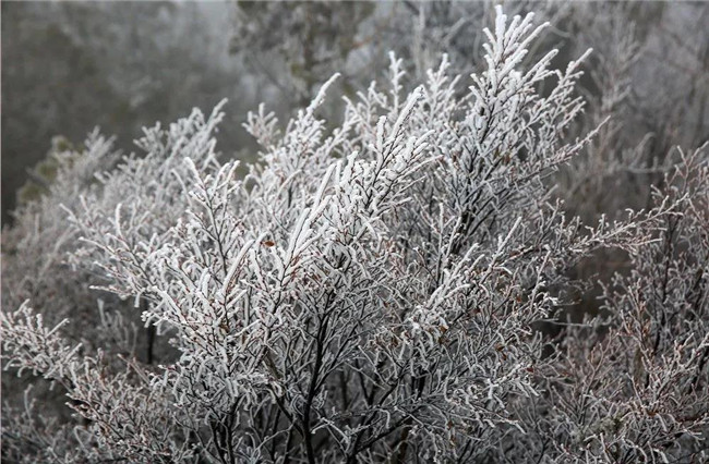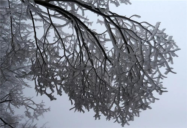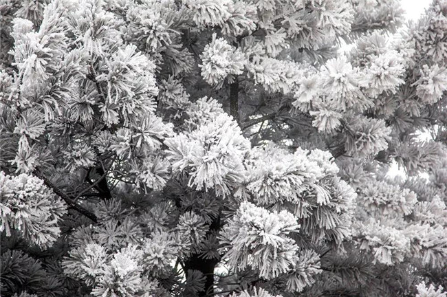 奇!樹木的枝干上掛著一根根白色的冰花,樹上卻堆積這細(xì)如粉的白雪,冷空氣像是個(gè)調(diào)皮的理發(fā)師,為樹木做了全新造型,迎接游人的贊賞。