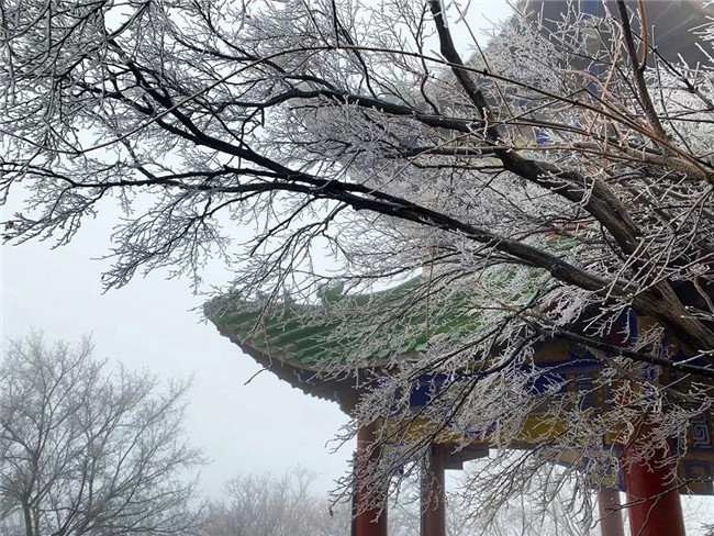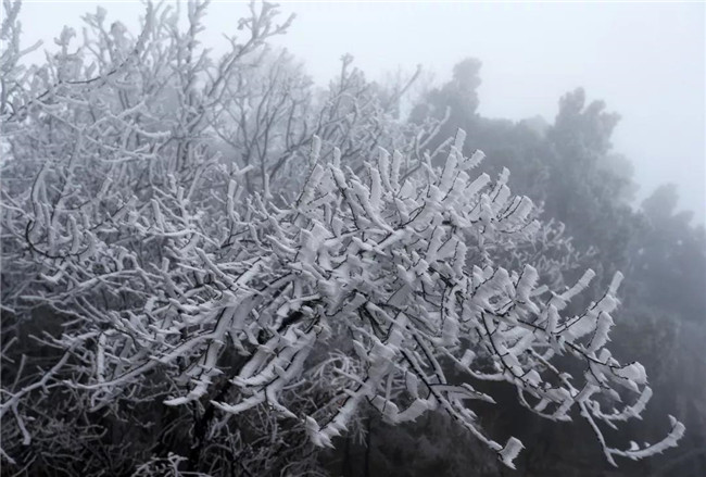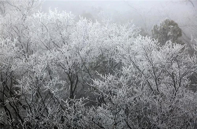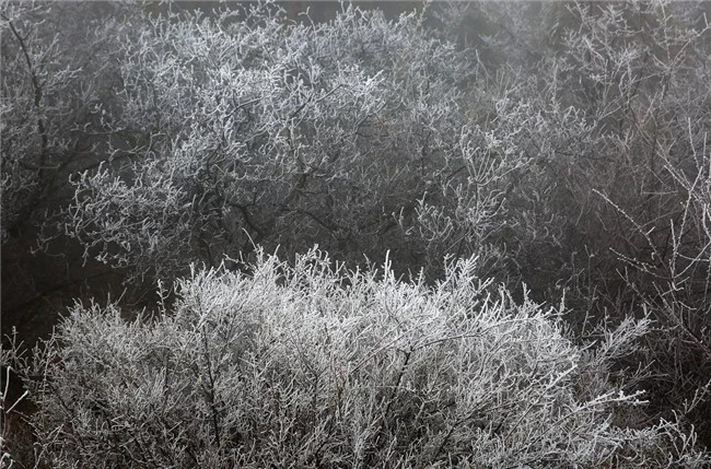 美!潔白無瑕,如沙、如鹽、如棉,在云臺(tái)山上,漫山的樹枝上拖著蓬松松,毛茸茸的霧凇,一陣風(fēng)過,玉屑似的雪末隨風(fēng)飄落,宛如雪下。