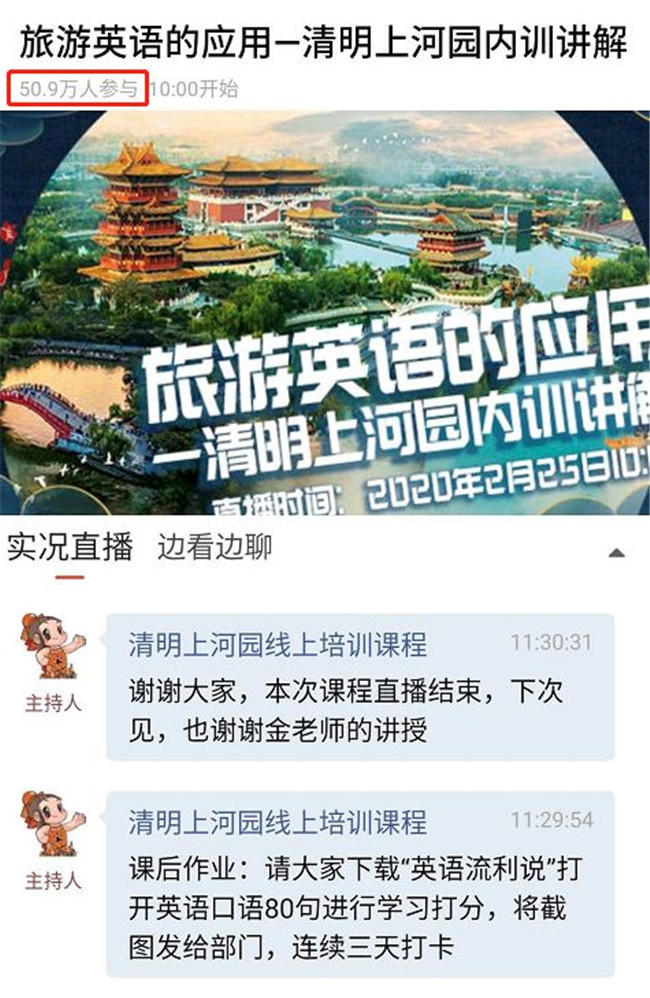 在景區(qū)閉園期間,積極組織員工開展線上學(xué)習(xí),勤修內(nèi)功、提升素質(zhì)。元宵佳節(jié)期間,員工更是自發(fā)為武漢亮燈、為中國祈福!同時,開展了系列直播活動,帶領(lǐng)粉絲們一起云游清明上河園!