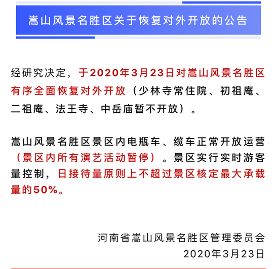 鑒于目前全國(guó)疫情逐漸好轉(zhuǎn),但仍沒(méi)有完全解除防控,嵩山景區(qū)在做好疫情防控工作的前提下,決定對(duì)除宗教場(chǎng)所及室內(nèi)展點(diǎn)以外的其他景點(diǎn)于3月23日正式恢復(fù)開(kāi)放。