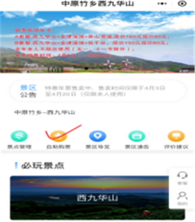 微信搜索(中原竹鄉(xiāng)西九華山)小程序并進(jìn)入首頁,或者現(xiàn)場(chǎng)掃碼(微信、支付寶通用)進(jìn)入小程序首頁。