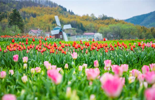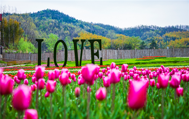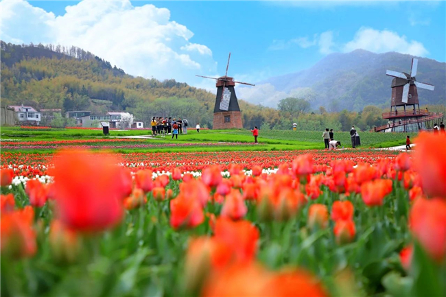 花千谷內(nèi)近百萬株郁金香盛開,春色滿園,爭(zhēng)芳斗艷,美景撩人,游客們?cè)诨ㄩg漫步,享受春日的暖陽。