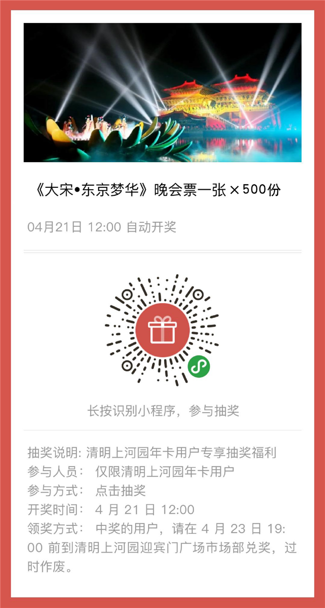 1.清明上河園年卡用戶專享福利全體清明上河園年卡用戶往這兒看!你們可是咱們大清園的“VIP用戶”,為了回饋你們對清明上河園的熱愛,本編特準(zhǔn)備了500張4月23日《大宋·東京夢華》晚會首演票,掃描下方二維碼,填寫相關(guān)信息,立刻抽獎。4月21日12:00,記得進入小程序查看噢。注意:此福利僅限清明上河園年卡用戶才可參與,非年卡用戶參與無效,采取實名制領(lǐng)獎,截屏、轉(zhuǎn)贈、帶領(lǐng)無效。使用時間:4月23日