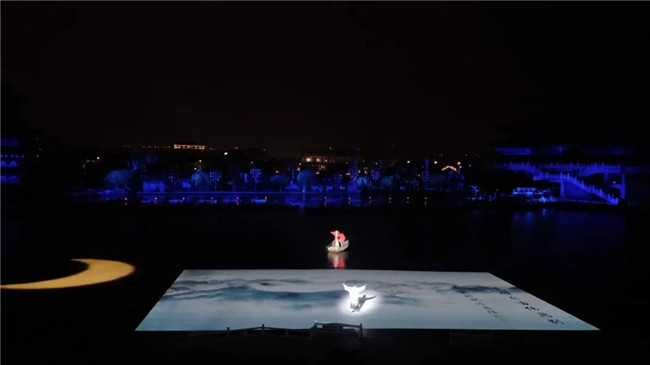 美輪美奐水中月一輪金黃的明月伴著小橋流水、葉葉扁舟,靜靜躺在湖面。少男少女翩翩起舞,亦真亦幻,引人無限遐想。