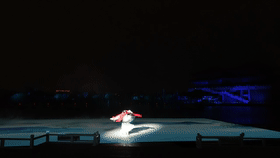 瞬間,煙霧彌漫,炮彈落到水面激起巨大的浪花。穆桂英率領(lǐng)上千熱血男兒一起征戰(zhàn)沙場,保家衛(wèi)國!整個演出場面都被染成紅色,充滿慘烈,讓人真切體驗到北宋時期的戰(zhàn)爭!