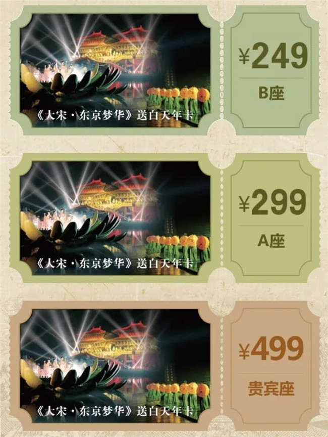 如:249元/人=249元/人(當日《大宋·東京夢華》晚會入場券)+128元/人(免費白天年卡)+120元/人(當日白天入園門票)