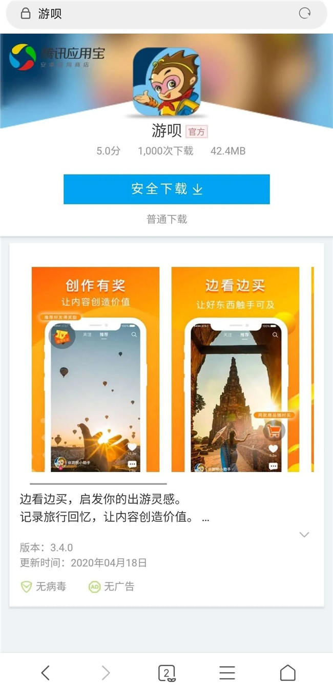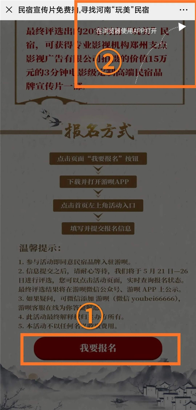 第一步:點擊活動頁面“我要報名”按鈕,點擊右上角按鈕,使用瀏覽器打開該活動鏈接,進入下載游唄app頁面