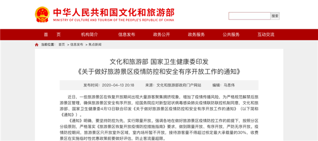 文化和旅游部、國家衛(wèi)生健康委4月13日聯(lián)合印發(fā)通知,要求疫情防控期間,旅游景區(qū)只開放室外區(qū)域,室內(nèi)場所暫不開放,接待游客量不得超過核定最大承載量的30%。