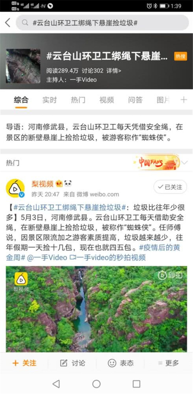 #云臺山亞洲最大停車場僅使用1/3#、#云臺山環(huán)衛(wèi)工綁繩下懸崖?lián)炖?、#站崗武警拒母親擦汗回敬軍禮#等話題登上微博熱搜。
