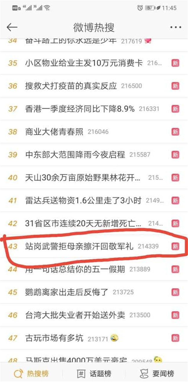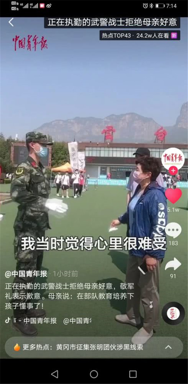 話題#正在執(zhí)勤的武警戰(zhàn)士拒絕母親好意登上抖音熱點(diǎn)榜,短時(shí)間內(nèi)獲得243.3W抖音用戶關(guān)注。