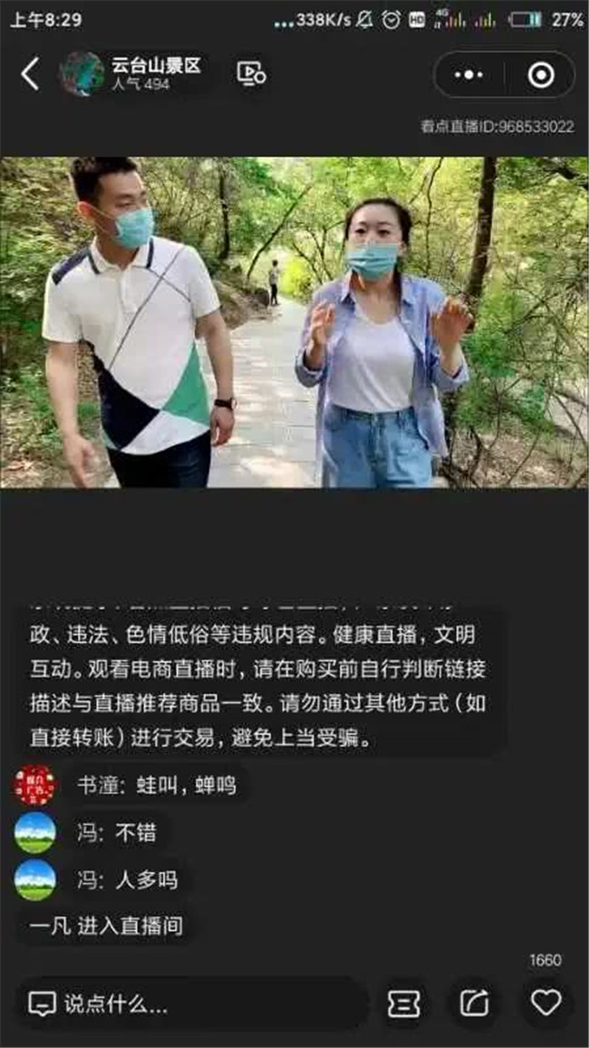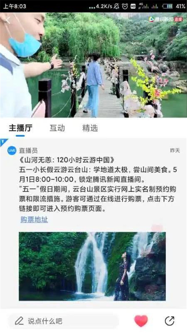 5月1日上午8:00,云臺山聯(lián)合騰訊開展120分鐘的“山河無恙 云游云臺山”直播活動(dòng),帶廣大網(wǎng)友線上云游云臺山初夏好風(fēng)光。